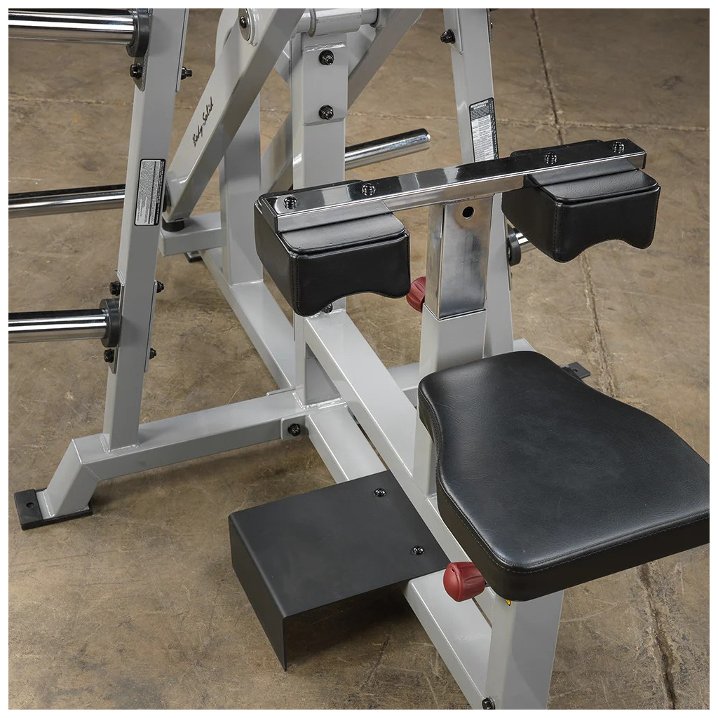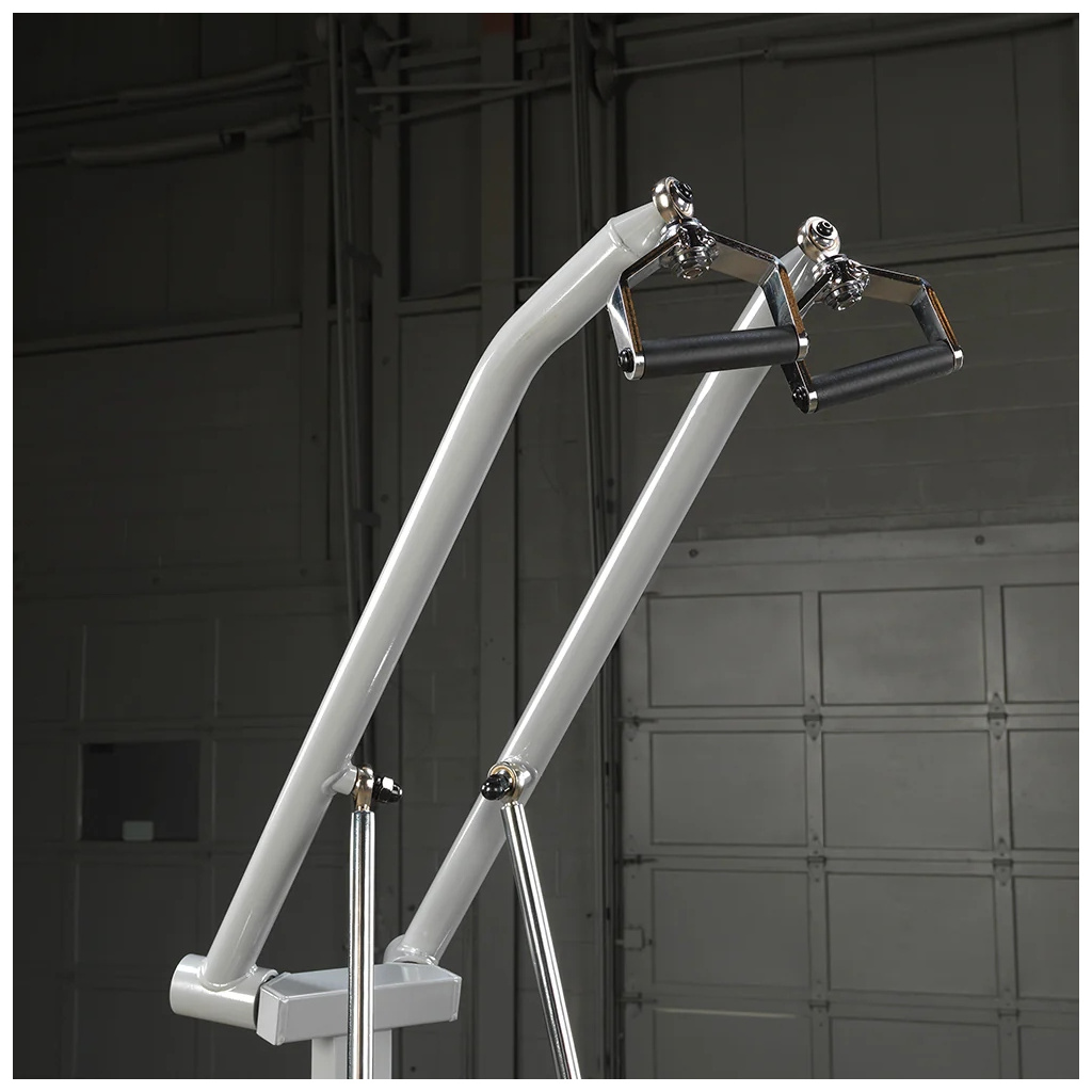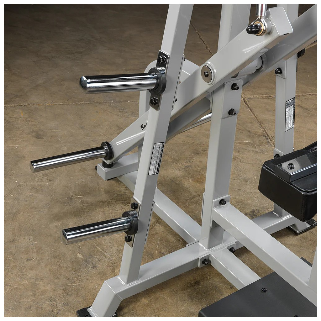 Body-Solid LVLA Leverage Lat Pulldown má oceľový rám s elektrostaticky nanesenou povrchovou úpravou z kovového strieborného práškového laku, utesnenými ložiskovými otočnými bodmi a držiakmi záťažových platní na odkladanie.