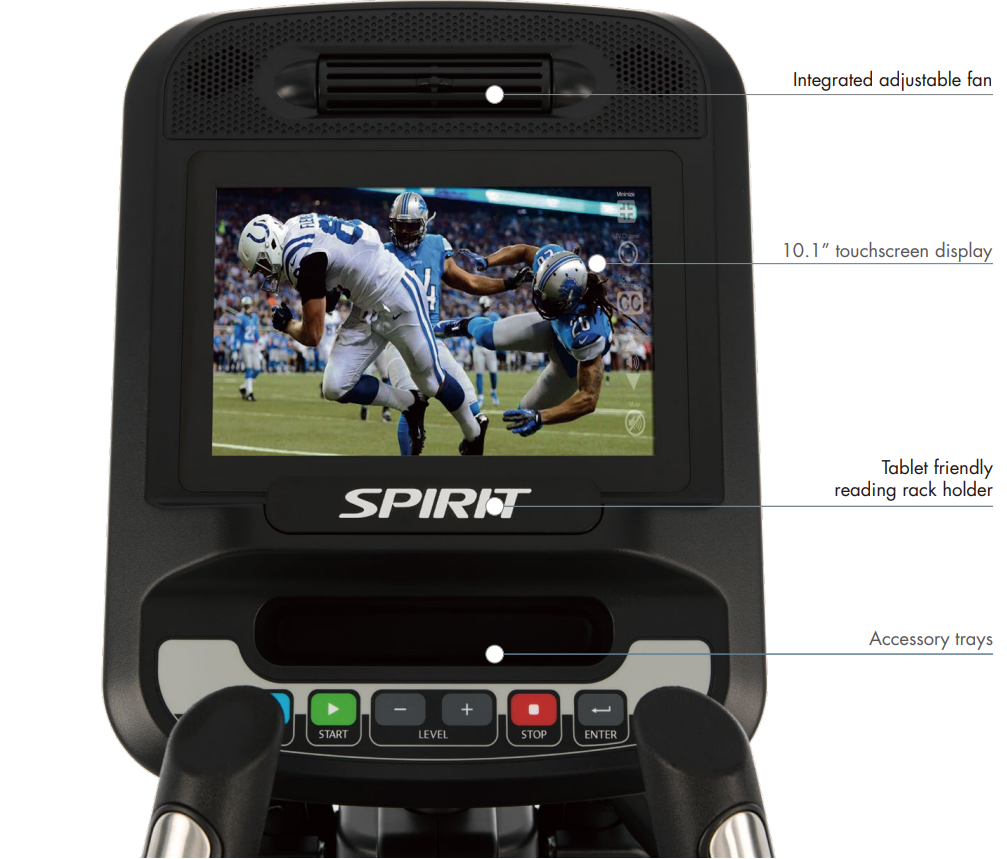 Model CE900TFT, vytvorený pre pohodlné a jednoduché cvičenie, je vybavený charakteristickou zábavnou konzolou Spirit, vďaka ktorej máte médiá na dosah ruky. Používatelia môžu sledovať televíziu, prehliadať internet alebo streamovať audio, zatiaľ čo pracujú na svojej kondícii, a to vďaka 25,6 cm dotykovému displeju.